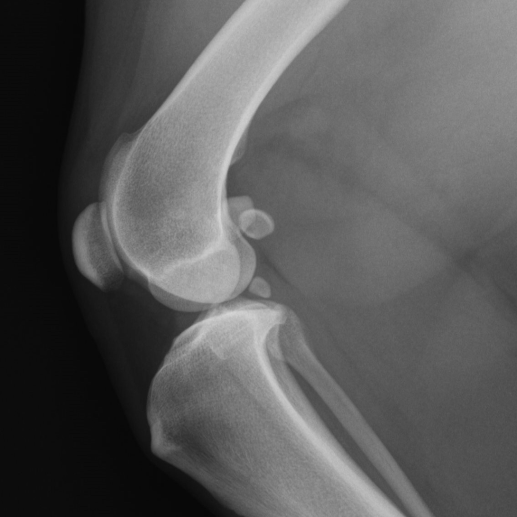 De knieschijf is permanent geluxeerd en de kraakbeensleuf is afgevlakt. De hond tilt de poot continu op en moet worden geopereerd.